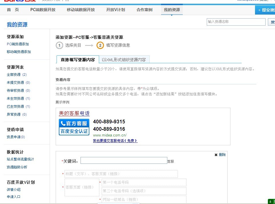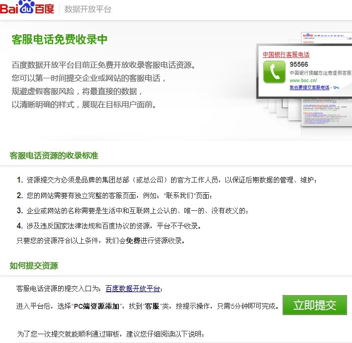 点击我公司品牌百度安全认证客服电话下的提交客服电话(免费)进入百度安全认证数据开放平台,如图所示: