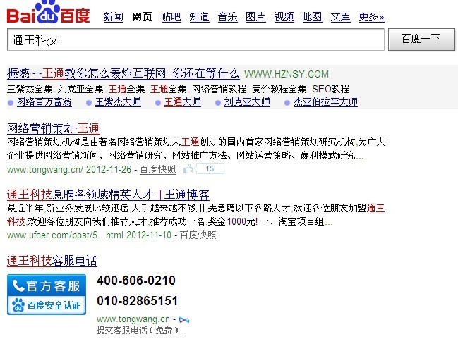 百度安全认证怎么做?接下来我会一步步教你操作。很多人可能找不到百度安全认证的入口。最简单的方法就是百度搜索一个经过认证的公司品牌名称。例如,搜索我们公司的品牌名称:王瞳科技。可以看到下图: