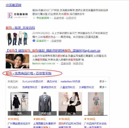 在搜索结果的第七名我们清楚的看到爱采购入驻商家的商品,给笔者第一印象非常的直观。当然了,百度这么做的目的就是为了提高用户体验度,同时拿更加直观的东西吸引搜索用户的眼球,诱导搜索用户进入“爱采购”,同时也让搜索用户忘记自己上搜索引擎是打算进阿里巴巴或京东商城购买服饰来的,瓜分某些平台的流量。