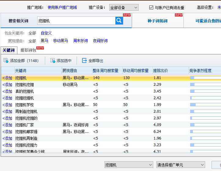 名词类:“挖掘机”该关键词搜索量大,客户购买意向小并且不明确,出价低。