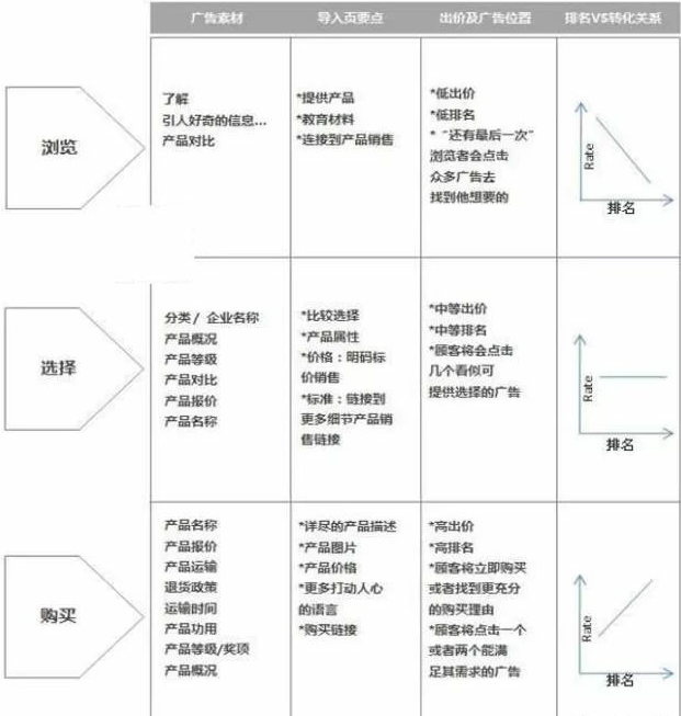 用户购买阶段:多数是品牌词等,搜索点击量最小,转化最高,所以出价也是最高。竞争也最激烈的。SEM在出价的时候,要合理的根据广告预算去抢排名。切不可全部都抢。