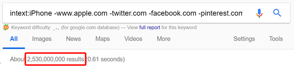 同样的,我们想知道内容中包含iPhone的页面,但是要除去自己品牌官网,推特,脸书,pinterest和油管的品牌提及,所以在谷歌的搜索框内填写以下内容