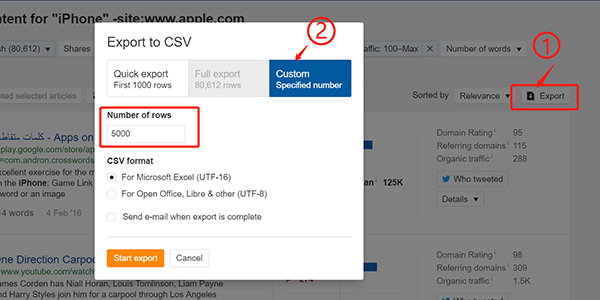 经过第二步筛选高质量高声量的内容过后,我们导出所有链接,可以看到小编这边是没有权限导出全部页面链接的,所以仅从Custom按钮中导出前5000个结果。大家也可以从不同维度进行筛选,尽量导出更多结果。