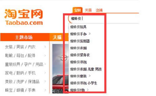 如图所示:这是近期淘宝搜索,关于蜘蛛侠相关产品的下拉搜索需求。