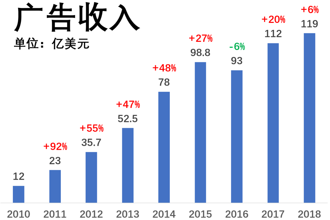 可以看到广告收入的增速在变小,到了2018年只有个位数增长,就目前的经济形势,2019年也不乐观。