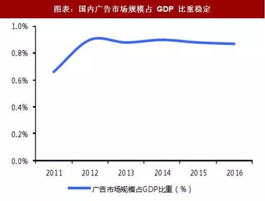 而国内的广告市场规模基本是恒定的,自12年以来维持在GDP的 0.9%左右。
