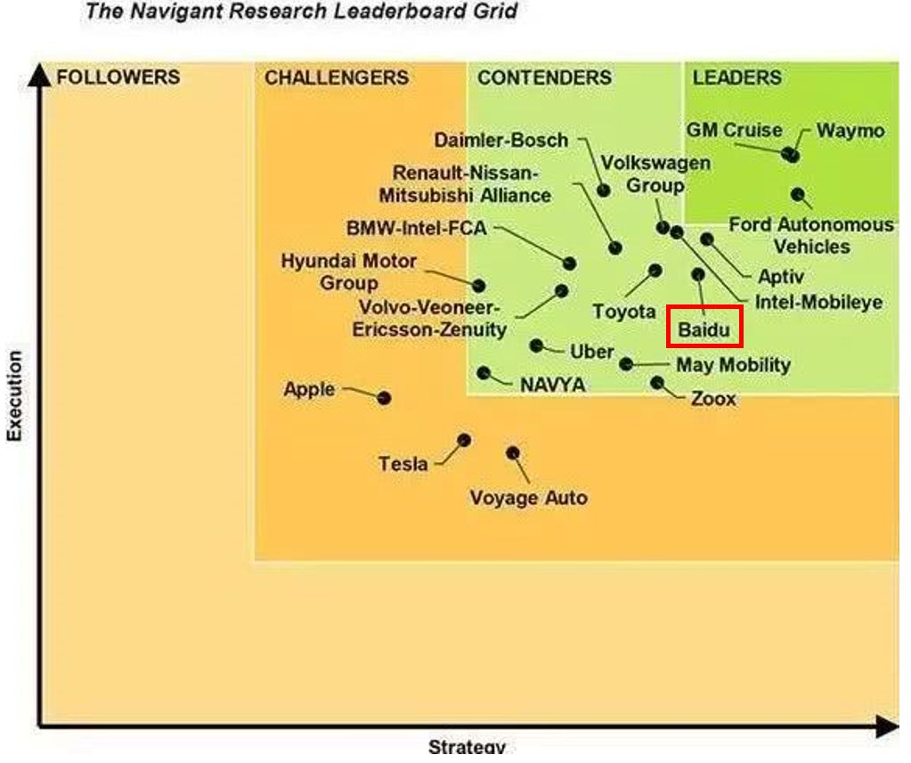 2019年3月,研究机构Navigant Research发布年度自动驾驶汽车排行榜,百度成功上榜,被划入第二等级。