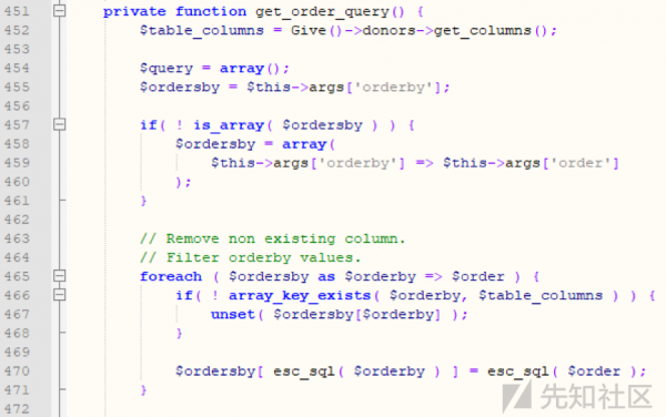 give插件,也存在漏洞,漏洞产生的原因是includes目录下的donors文件夹里的class-give-donors-query.php代码,在获取订单的函数中,没有对其order by字符进行拦截,导致sql代码可以到后端进行查询数据库,导致sql盲注。代码如下: