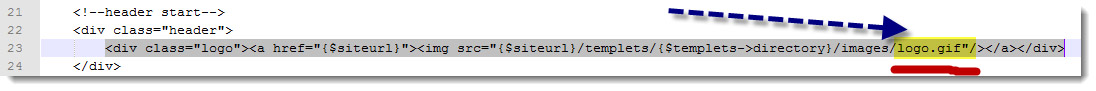 打开header.tpl文件之后找到第23行的代码:<div class=”logo”><a href=”{$siteurl}”><img src=”{$siteurl}/templets/{$templets->directory}/images/logo.gif”/></a></div>