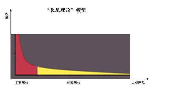 如上图,长尾示意图所示:我们可以看出左边的是热门产品的销售数据,数量不是很多仅仅也只是几件而已。而右侧的种类一直无限的衍生下去,几乎没有尽头。从图中可以看出长尾类的单个产品销售的数量非常的小,但是把所有的长尾产品加起来,这数量就很惊人了,真正实现长尾效应。