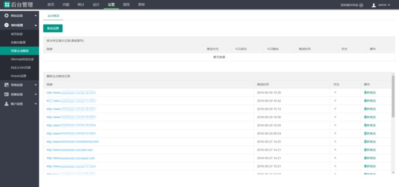 · 设置完成以后每天发布文章后文章可以网站自己进行主动推送,站长只需要偶尔看下推送成功与否,如果推送失败点击重新推送即可。