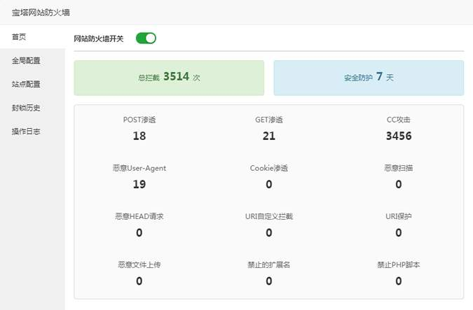 宝塔面板的防火墙是面向站点的规则应用,可单独关闭或开启一个站点的防护功能,高度自由的规则应用,允许用户编辑和选择某一站点是否使用此规则。
