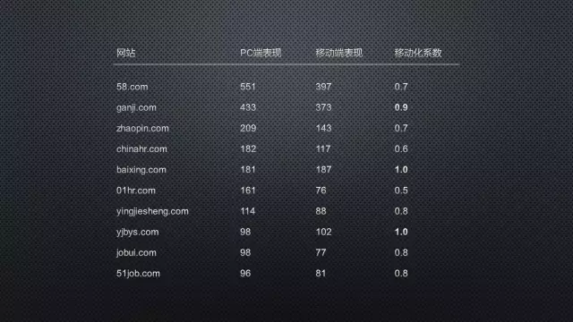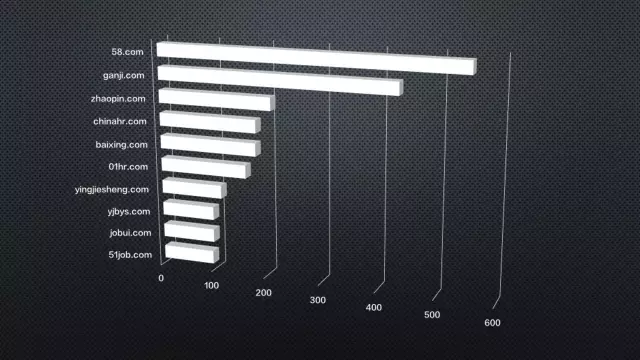 从该数据明显可见的是,三大招聘网站(智联、前程无忧、中华英才)的流量其实并不理想,其流量很显著的差于58同城和赶集网。