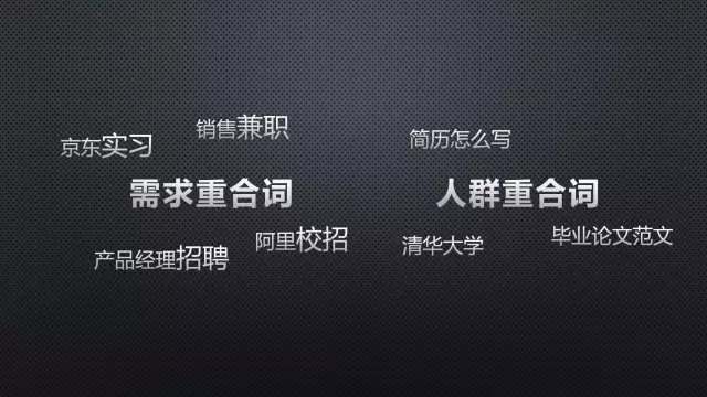 (1)需求重合 对于实习僧,如“京东实习”、“阿里校招”、“销售兼职”一类即为需求高度重合的词;同时,值得注意的是,如单独的公司名字,也是需求部分重合的词,因为有许多求职者通过直接搜索公司名字来了解公司情况。