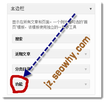 除了wordpress.org链接外,还有文章RSS以及评论RSS链接。如果,我们希望把这几个链接删除该怎么操作呢,最简单的方法是把功能这个版块直接去掉,可以在外观-主题-小工具里把功能直接移除。