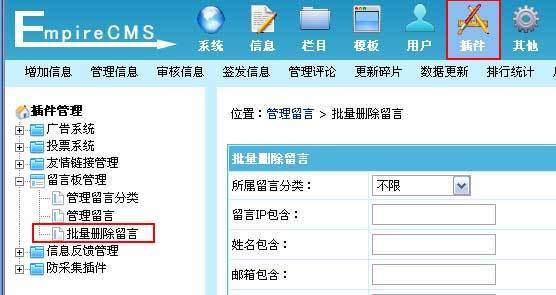 1、登录后台,单击“插件”菜单,选择“批量删除留言”子菜单,进入批量删除留言界面: