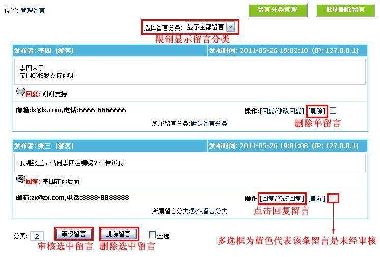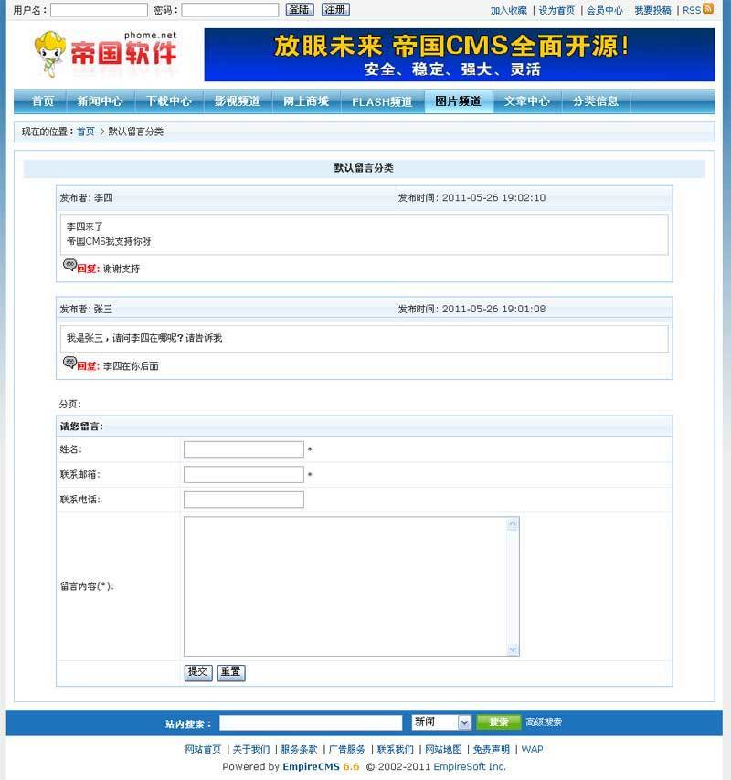 帝国CMS的留言板系统支持多分类,一个分类为一个单独的留言板。