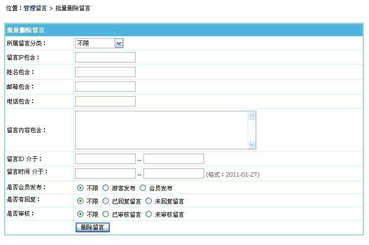 | 是否会员发布 | 选择是否只删除游客/会员发布的留言。 |