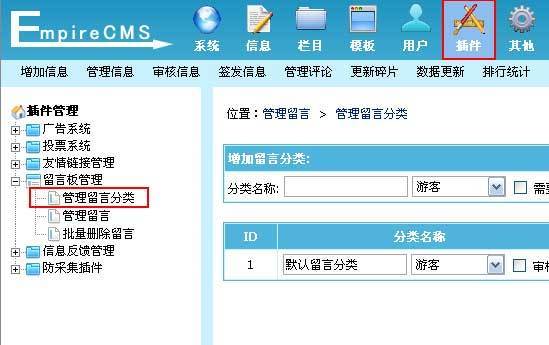 (一)、登录后台,单击“插件”菜单,选择“管理留言分类”子菜单,进入管理留言分类界面: