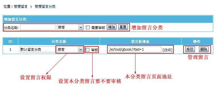 (二)、进入管理留言分类界面:
