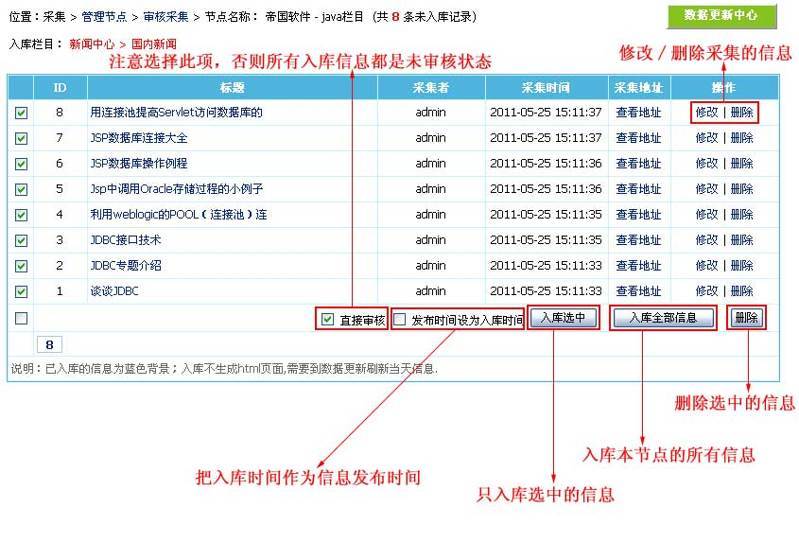 1、从上面的“管理采集节点”点击“审核采集”进入如下界面:
