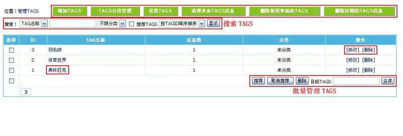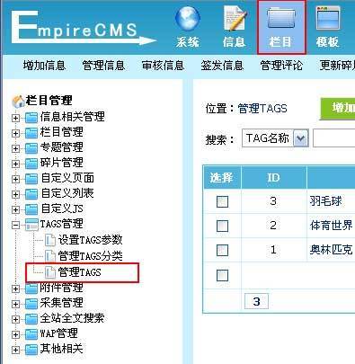 1、登录后台,单击“栏目”菜单,选择“管理TAGS”子菜单,进入管理TAGS界面: