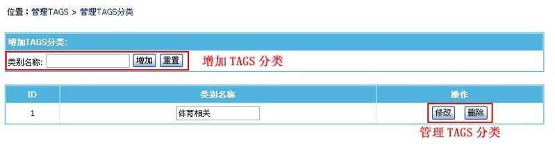 1、登录后台,单击“栏目”菜单,选择“管理TAGS分类”子菜单,进入管理TAGS分类界面: