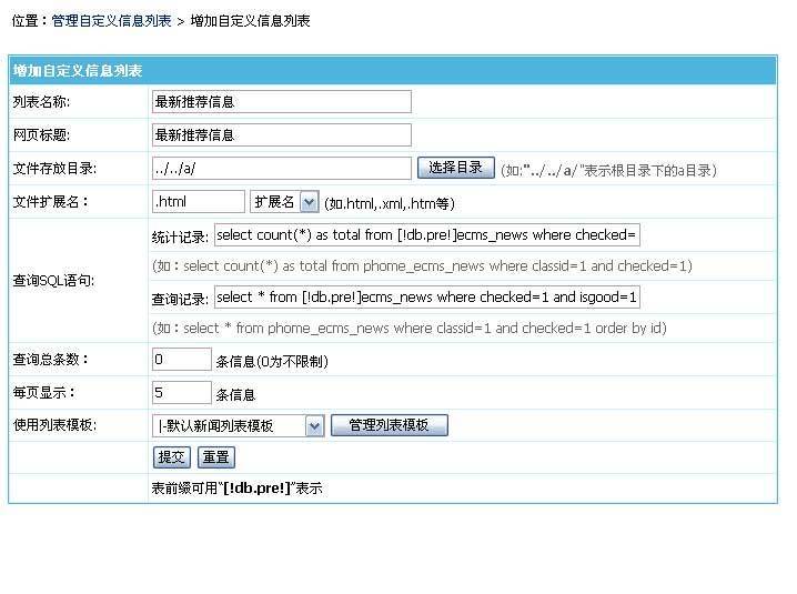 自定义列表功能:除了系统内置固定的栏目页、专题页等列表页面外,用户还可以通过SQL条件生成相应信息列表页面,实现各种信息集合列表更加灵活。
