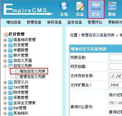 1、登录后台,单击“栏目”菜单,选择“增加自定义列表”子菜单,进入增加自定义列表界面: