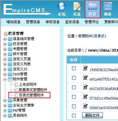 1、登录后台,单击“栏目”菜单,选择“目录式管理附件”子菜单,进入目录式管理附件界面: