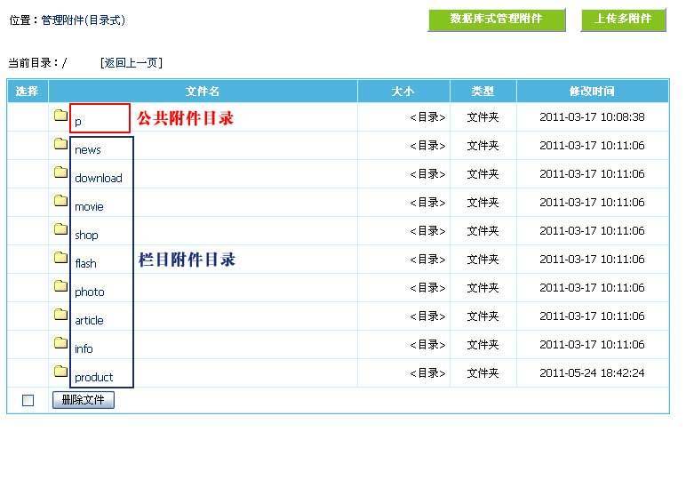 图1:由于本教程设置附件按栏目目录存放,故图中,从非栏目上传的附件均存放于P目录中,其余9个目录为栏目上传的附件目录。
