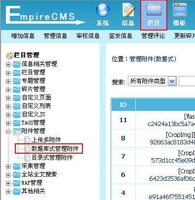 1、登录后台,单击“栏目”菜单,选择“数据库式管理附件”子菜单,进入数据库式管理附件界面: