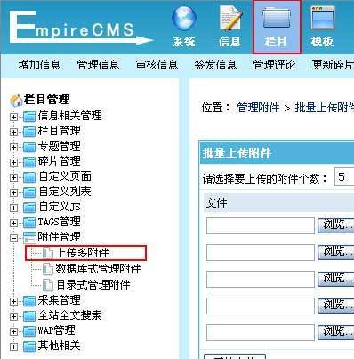 1、登录后台,单击“栏目”菜单,选择“上传多附件”子菜单,进入上传多附件界面: