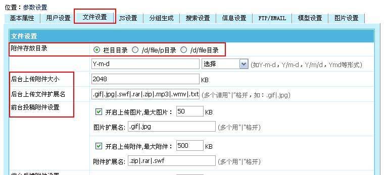 单击菜单“系统”>“系统设置”>“系统参数设置”子菜单,进入网站基本信息配置界面,单击“文件设置”属性进行附件存放目录设置: