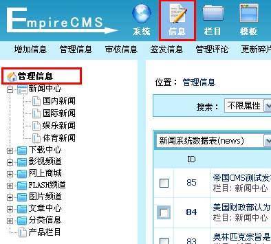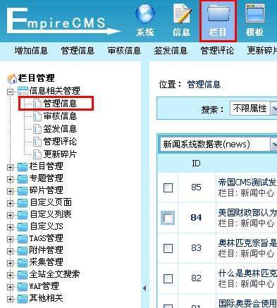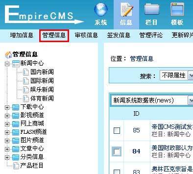 途径四:单击“栏目”菜单,左侧出现栏目管理子菜单界面,单击“管理信息”子菜单,见下图,进入管理信息界面。