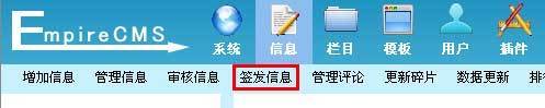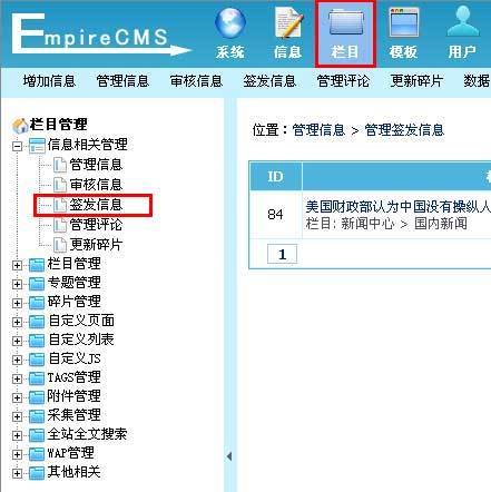 方法2:单击“栏目”菜单,左侧出现栏目管理子菜单界面,单击“签发信息”子菜单,进入管理签发信息界面, 见下图: