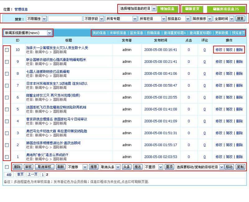 | 多选框蓝色为未审核信息;发布者红色为会员投稿;信息ID粗体为未生成,点击ID可刷新页面。 | |
