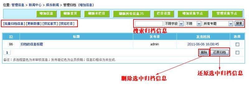 归档/还原归档多栏目信息时,可使用批量归档信息功能,操作可见管理员手册。