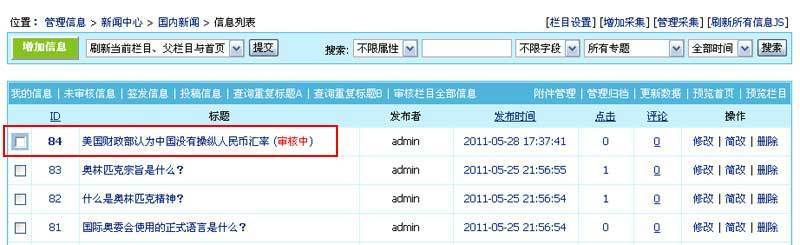| 审核栏目全部信息 | 将本栏目的所有信息状态设为已审核。 |
