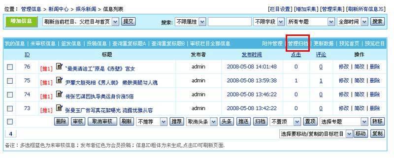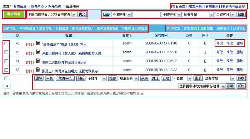 | 管理信息界面功能介绍(按栏目管理) |