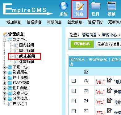 途径三:进入单个栏目下的信息管理。单击“信息”菜单,左侧出现栏目菜单列表界面,选择要管理信息的终极栏目(如栏目“娱乐新闻”)并单击,见下图,进入管理信息界面。