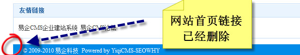 从图中可以看出底部导航总共有这几个部分组成,首先就是网站首页,这是一个链接的形式,接下来就©2009-2010文本形式,在接下来就是易企科技链接形式,之后就是powered by yiqicms-seowhy。