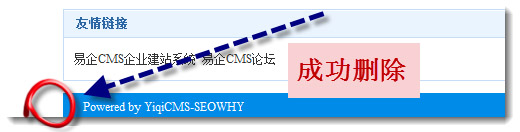 最后我们需要修改的是powered by yiqicms-seowhy,这时候还是一样修改footer.tpl这个文件,在第九行找到以下代码:Powered by <a href=”http://www.yiqicms.com/” target=”_blank”>YiqiCMS</a>-<a href=”http://www.seowhy.com/” target=”_blank”>SEOWHY</a></div>
