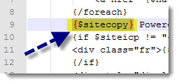 现在我们解决如何去掉© 2009-2010以及易企科技这个链接,先通过ftp软件连接空间,然后把/templets/default/下的footer.tpl文件传输到本地电脑,用notepad++软件打开,找到第九行的这个代码:{$sitecopy},