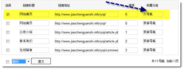 现在要想对底部导航进行修改,我们采取的一个策略就是一一攻破。先来解决网站首页链接,修改这个位置,我们可以通过yiqicms网站后台的模版管理下的导航管理,