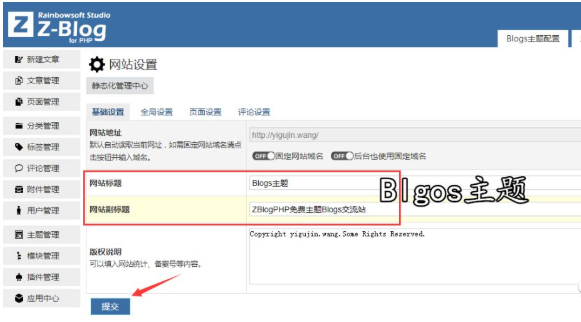 登录 ZBlogPHP 网站后台 >> 点击右上角的“网站设置”按钮 >> 在基础设置中的网站标题和网站副标题中填写相应的内容,如标题写:Blogs 主题;副标题写:ZBlogPHP 免费主题 Blogs 交流站 >> 点击【提交】按钮。具体见下图:
