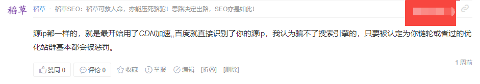 1楼:源ip都一样的,就是最开始用了CDN加速,,百度就直接识别了你的源ip,我认为骗不了搜索引擎的,只要被认定为你链轮或者过的优化站群基本都会被惩罚。