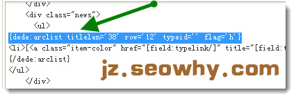 在首页文件index.htm代码中,我们会看到{dede:arclist titlelen=’38’ row=’12’ typeid=” flag=’h’},修改栏目的id就