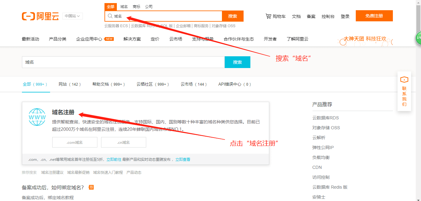 1.1、百度搜索进入阿里云,然后在阿里云上搜索“域名”