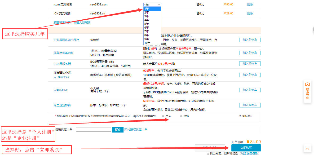 1.5、选择好“购买年份”,选择是“个人”还是“企业”,最后点击“立即购买”完成域名的购买